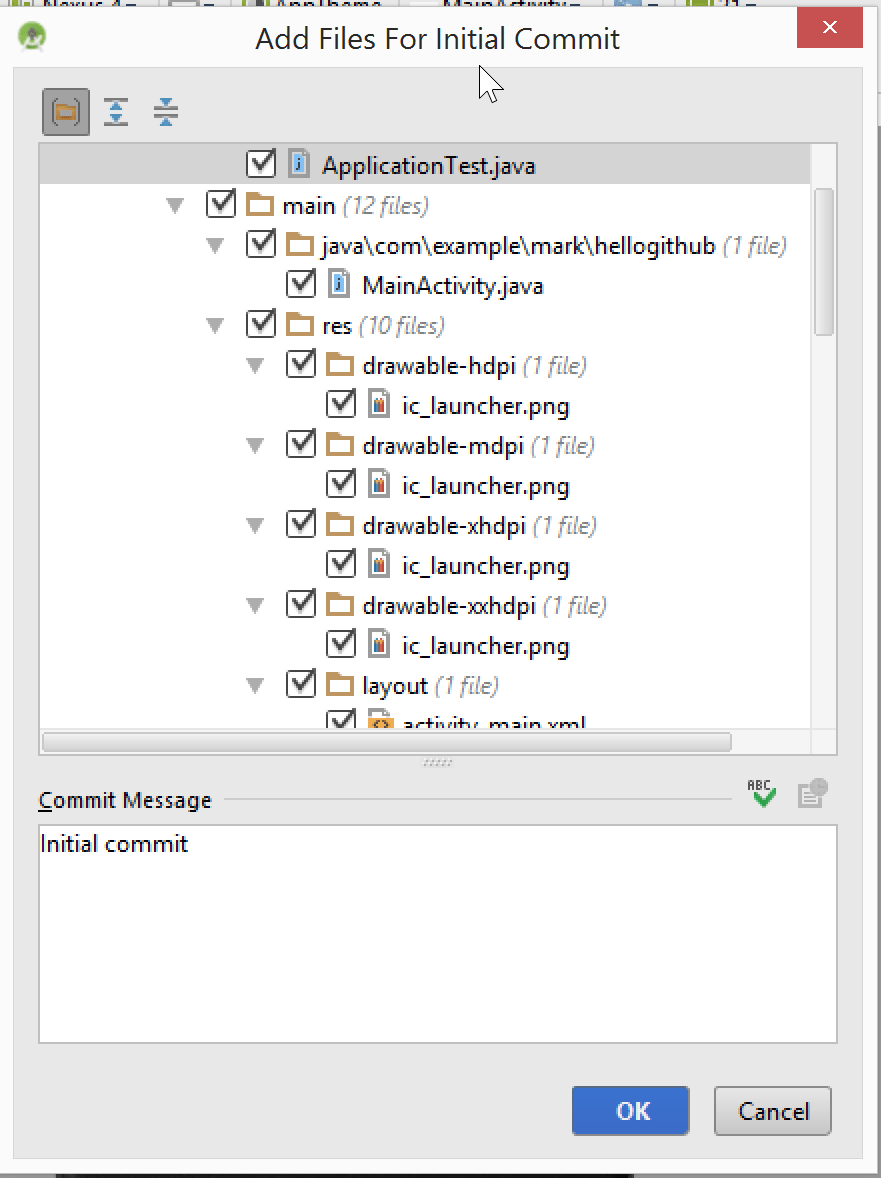 Next, you will be prompted with the Add Files for Initial Commit screen. This is where you can select the files to commit to your Git repository before you push it to GitHub. Usually you will want to select all files, however there are some cases where you may wish to exclude certain files which contain security keys, passwords etc… Check the files and click OK to push to GitHub.
